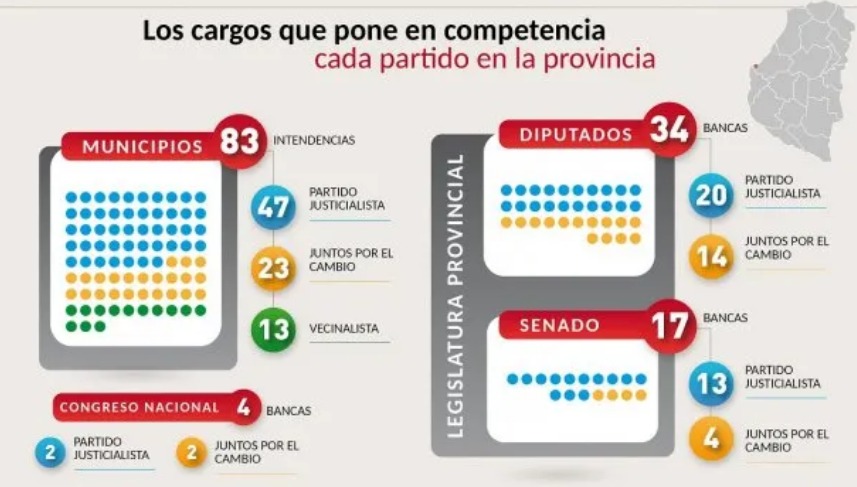 Son 83 municipios distribuidos en 17 departamentos. Todas sus intendencias se votarán primero el 13 de agosto, en las Primarias, Abiertas, Simultáneas y Obligatorias (PASO), y los candidatos que resulten de este primer comicio competirán en las generales del 22 de octubre. El Partido Justicialista someterá a reválida sus gestiones en 47 ciudades, en todos los casos bajo la boleta provincial que tendrá como candidato a gobernador a Adán Bahl y el cuerpo nacional de ese papel que mostrará a Gustavo Bordet postulado para diputado nacional.
