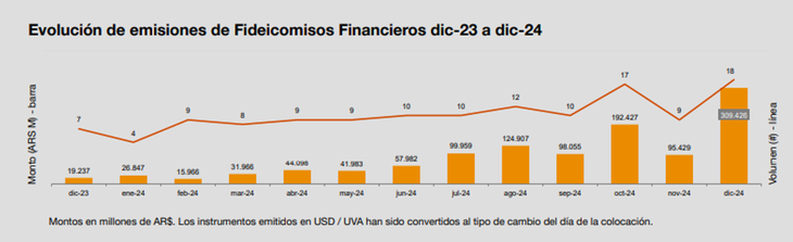 “El volumen mensual de emisiones de fideicomisos financieros fue el más alto del año con 18 licitaciones, de las cuales 17 fueron denominadas en pesos y 1 en UVA, registrando un importe total de $309.426 millones (aumento nominal del 224% contra el mes anterior)”, destacó el informe.