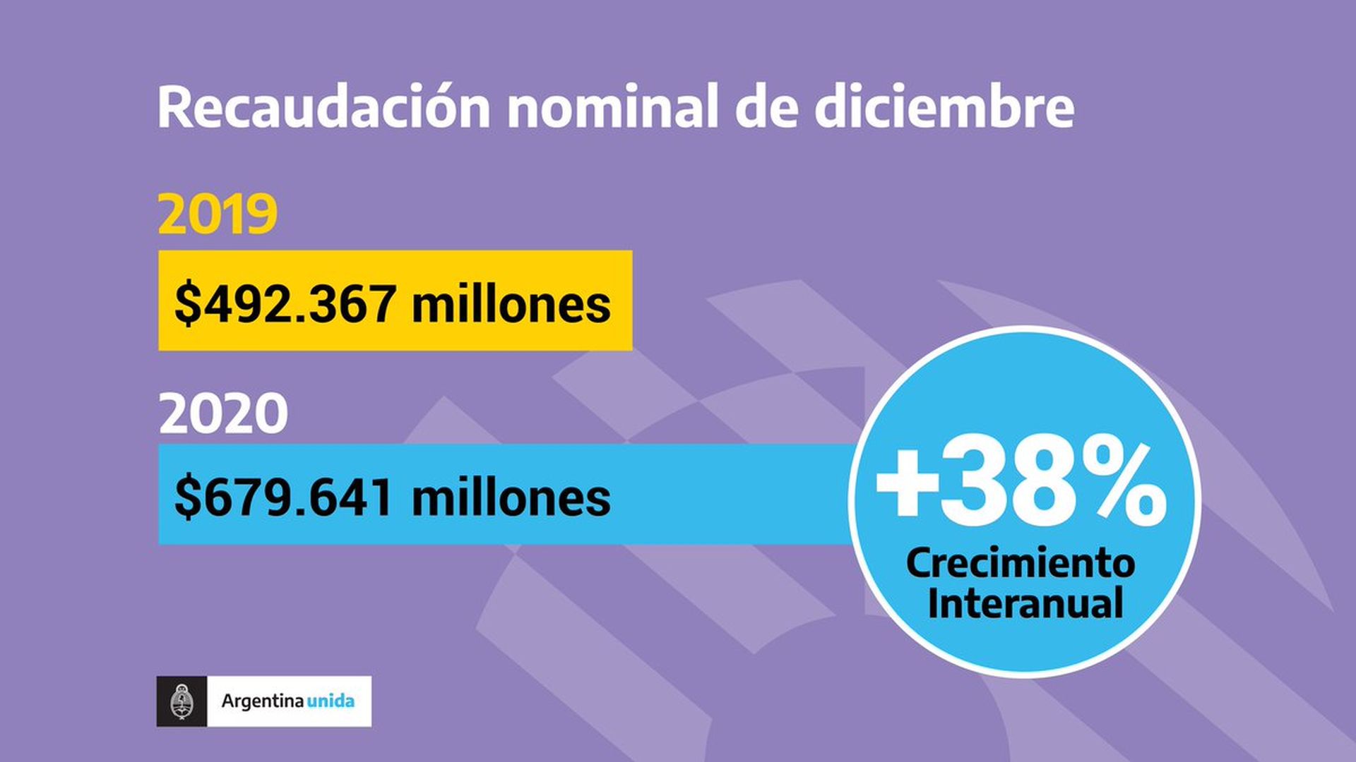 En total, la recaudación de 2020 fue de 6 billones 635 millones de pesos y, según destacó el Palacio de Hacienda en un comunicado, el crecimiento de la recaudación responde a «una consistente mejora en el nivel de actividad asociado al mercado interno y por el efecto positivo de la Ley de Solidaridad Social y Reactivación Productiva”.