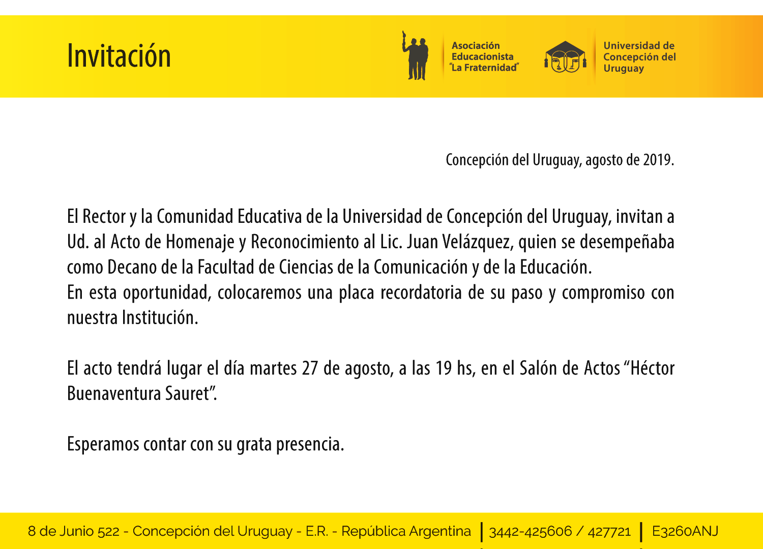 En el Día de la Radiodifusión argentina, la Universidad de Concepción del Uruguay rendirá homenaje a Juan Velázquez, locutor y periodista que falleciera hace pocos meses. La actividad será el martes 27 de agosto, desde las 19 horas en el salón de actos de la Universidad, organizada por la carrera de Locución y Periodismo.
