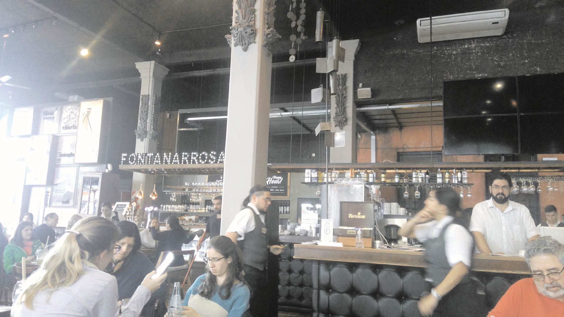 PD: adjunto otra foto de otra parte de la barra donde dice «Fontanarrosa», y abajo a la derecha, con remera roja, barba y anteojos, uno de los «galanes».