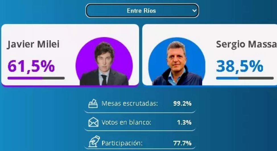 - Gualeguaychú: Javier Milei 52.248 votos (64 %), Sergio Massa 28.293 votos (35 %)