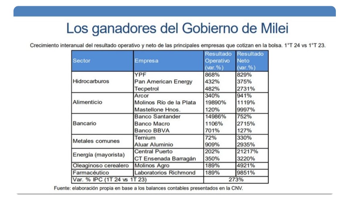 Los ganadores, es decir, “las grandes corporaciones que multiplicaron su rentabilidad al calor de la crisis económica y social son la contracara de la política ajuste que suele soslayarse”, agregó la entidad. estas empresas, que cotizan en la Bolsa de Buenos Aires y operan en sectores y ramas beneficiados por la política económica de los primeros seis meses de gobierno, tuvieron en promedio “un resultado operativo en 687,5 por ciento”. Si al resultado neto “se le incorpora ganancia financiera, participación en sociedades, el pago del impuesto a las ganancias entre otros conceptos aumentó en 831,1 por ciento”.