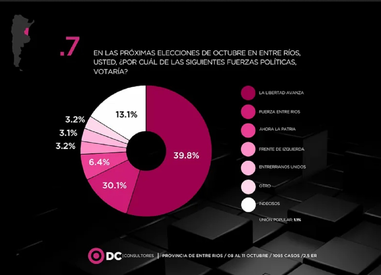 La última encuesta de DC Consultores, realizada en Entre Ríos entre el 8 y el 11 de octubre, muestra que la alianza La Libertad Avanza lidera la intención de voto para las elecciones legislativas nacionales del domingo 26 de octubre.