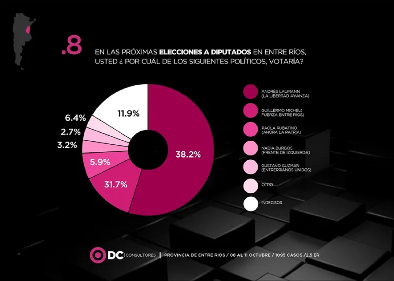 Para Diputados, lidera en intención de voto el libertario Laumann, con el 38,2%. Lo siguen Michel, de Fuerza Entre Ríos, con 31,5%; Gustavo Guzmán, de Entrerrianos Unidos, con el 6,4%; Paola Rubattino, de Ahora 503, con el 5,9%; Nadia Burgos, del FIT, con el 3,2%; “Otro”, con el 2,7%; y como indeciso se reportó el 11,9%.