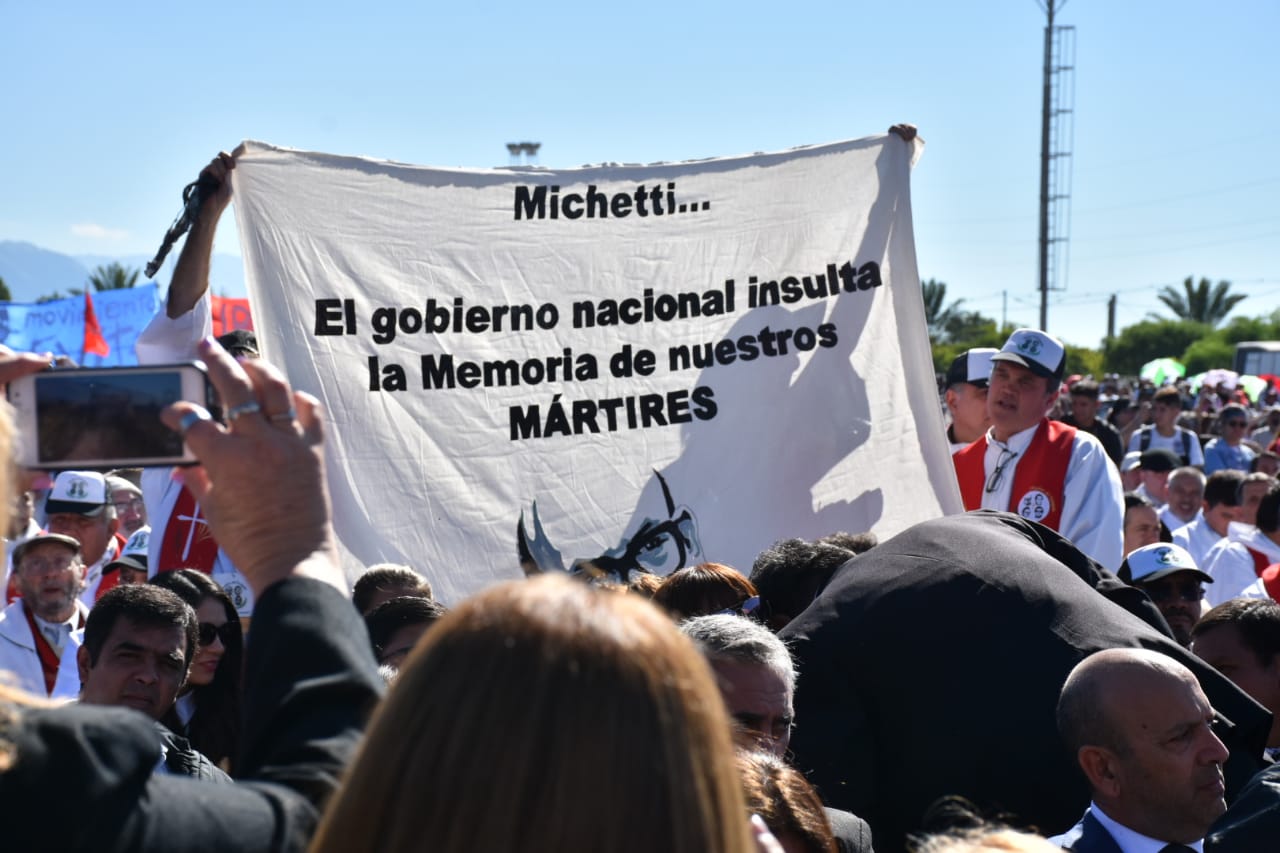 Sin embargo, en el inicio de la ceremonia un grupo de sacerdotes, varios de ellos del Movimiento de Curas en Opción por los Pobres, desplegó entre el público una pancarta en la que se leyó: «Michetti: el gobierno nacional insulta la memoria de nuestros mártires».