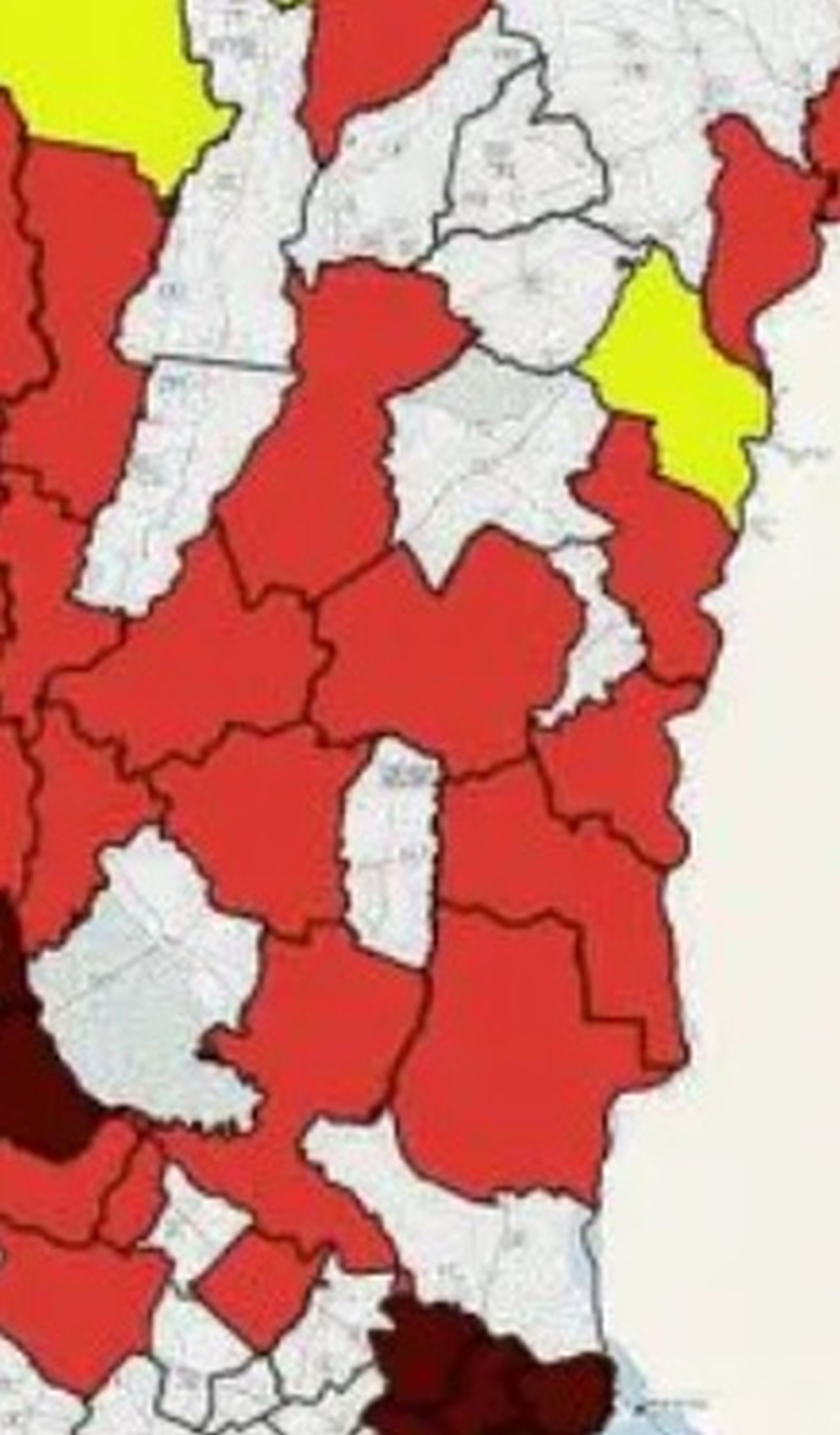 – En la categoría de alto riesgo, que en el mapa es advertido con el color naranja y es el que más localidades figuran, aparecen 118 departamentos y aglomerados que pertenecen a las provincias de Buenos Aires, Catamarca, Chaco, Chubut, Córdoba, Corrientes, Entre Ríos, Formosa, La Pampa, Mendoza, Misiones, Neuquén, Río Negro, Salta, San Juan, San Luis, Santa Fe, Tucumán, Tierra del Fuego, Santiago del Estero, Jujuy, La Rioja, Santa Cruz.