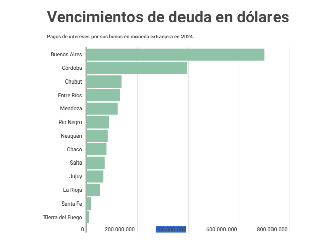 En total, el 2024 contempla pagos por unos USD 1.950 millones desde las provincias, de los cuales faltan pagar alrededor de USD 1.170 millones. Córdoba será la que tendrá la carga de intereses más pesada (USD 357 millones), seguido por Buenos Aires (USD 350 millones), Salta (USD 70,5 millones), Chubut (USD 68,8 millones) Entre Ríos (USD 65 millones) y Mendoza (USD 61 millones).