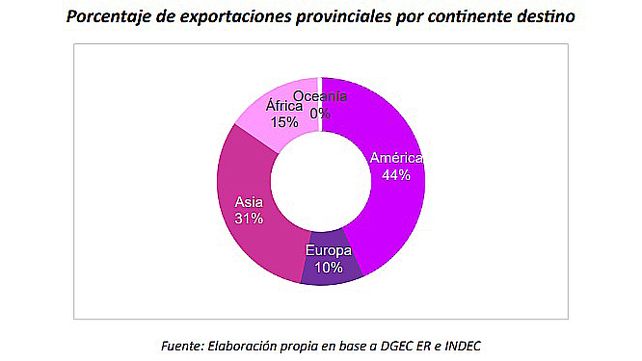 Los principales destinos de las exportaciones entrerrianas fueron América (460 millones de dólares) y Asia (330 millones). En menor medida, África recibió 159 millones, Europa 104 millones, y Oceanía solo 3 millones.