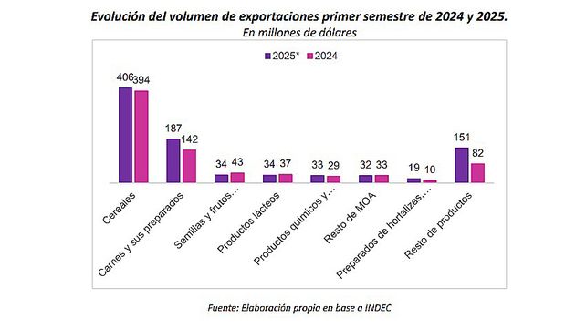 De los principales rubros exportados en el primer semestre de 2025, los más destacados fueron los «cereales» (45%) y las «carnes y sus preparados» (21%). Las exportaciones de cereales crecieron un 3%, mientras que las de carnes aumentaron un 43% en comparación con el mismo semestre del año anterior.