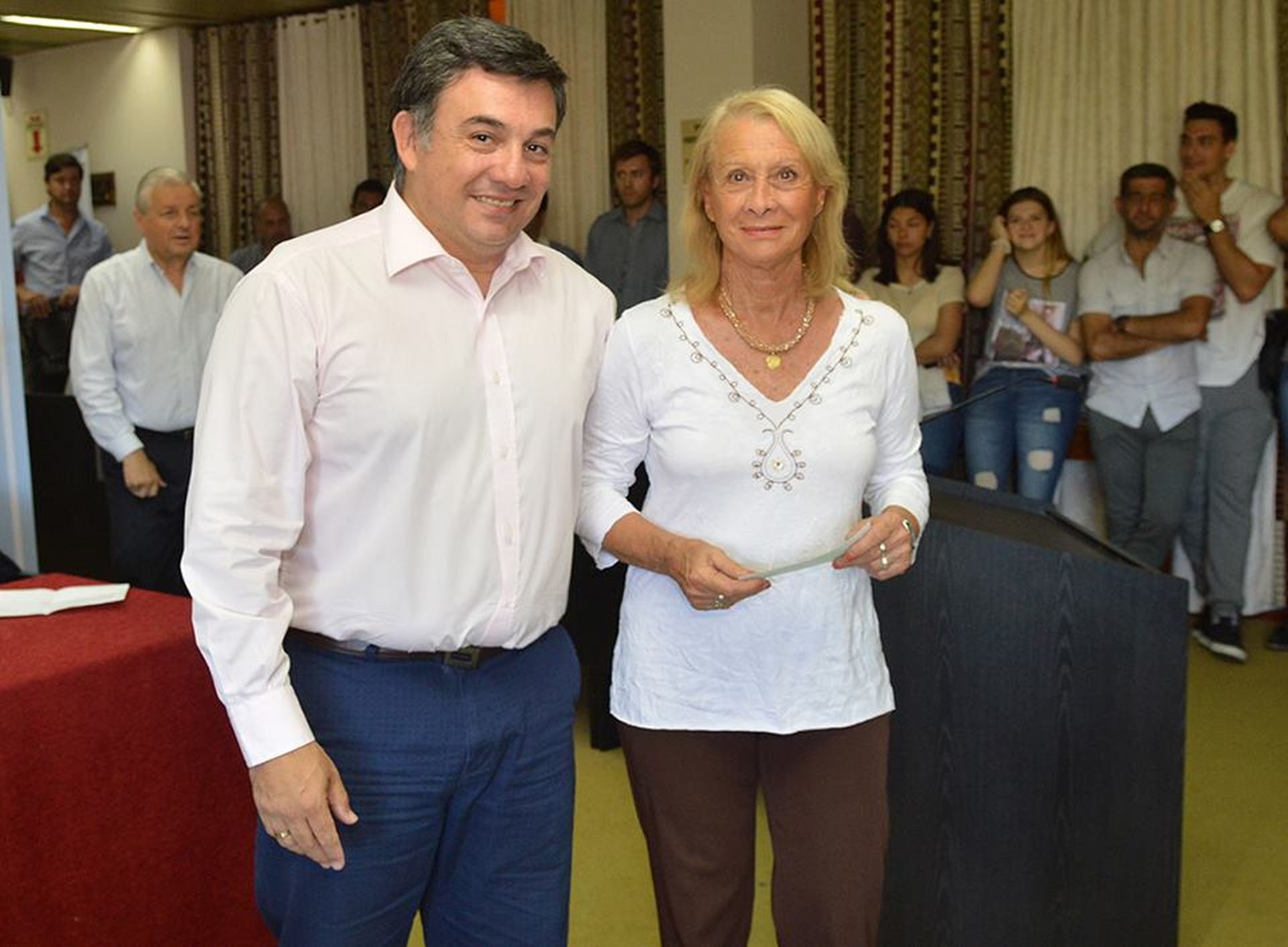 A la directora de la Escuela N° 116, Silvina Broggi, se le entregaron $ 10.000 destinados al viaje de fin de curso de alumnos del 2° ciclo, en tanto el presidente del Club Almafuerte, Emilio Dellagiovanna, recibió $ 20.000 para el festival de boxeo a realizarse este sábado.