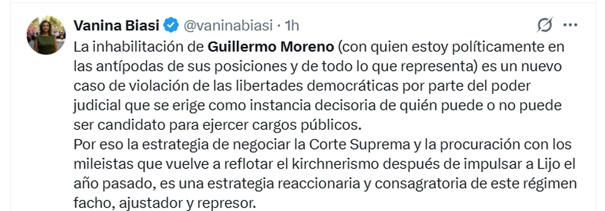 Incluso desde la Izquierda, la legisladora Vanina Biasi tuiteó que «la inhabilitación de Guillermo Moreno (con quien estoy políticamente en las antípodas de sus posiciones y de todo lo que representa) es un nuevo caso de violación de las libertades democráticas por parte del poder judicial que se erige como instancia decisoria de quién puede o no puede ser candidato para ejercer cargos públicos».