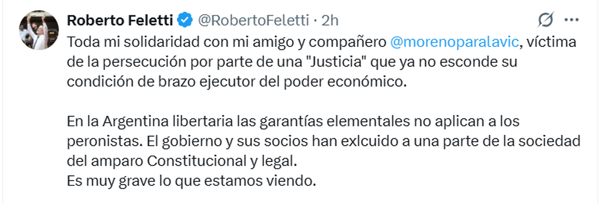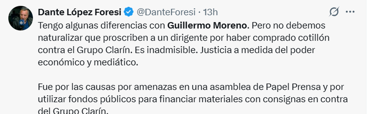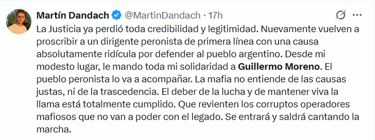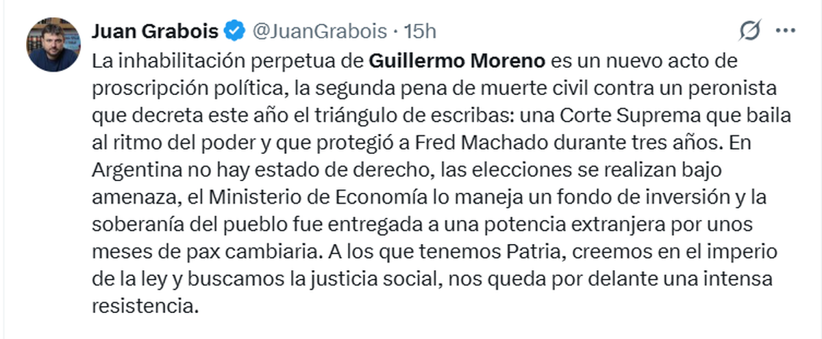 El primero que salió a bancar a Guillermo Moreno y hablar de «proscripción» fue Juan Grabois: «La inhabilitación perpetua de Guillermo Moreno es un nuevo acto de proscripción política, la segunda pena de muerte civil contra un peronista que decreta este año el triángulo de escribas: una Corte Suprema que baila al ritmo del poder y que protegió a Fred Machado durante tres años«, escribió en su cuenta de X.