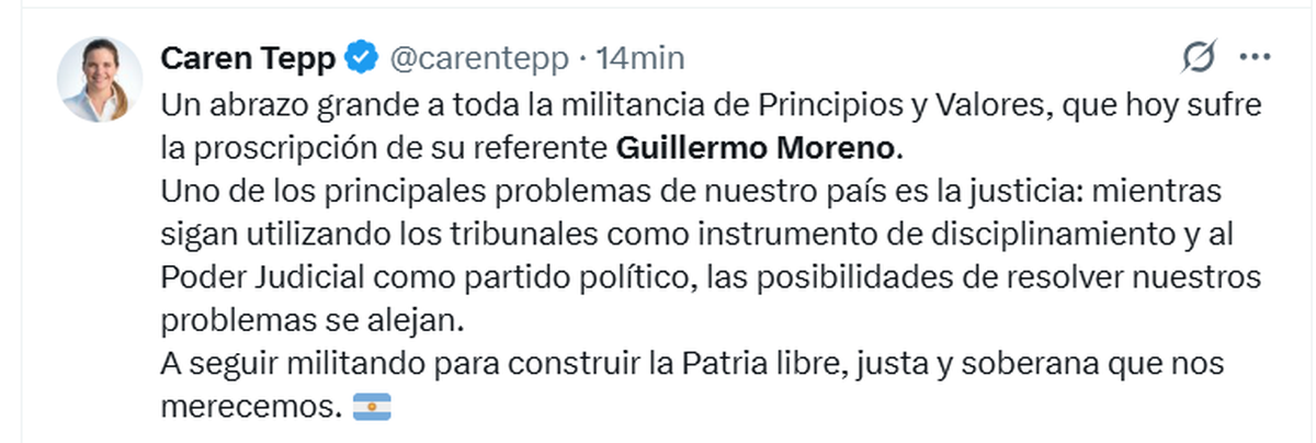 «Anoche hablé con Guillermo Moreno, me puse a disposición suya y de su familia porque a los compañeros se los banca en las injusticias. Entre otros miles de valores del peronismo, acompañar al perseguido político, tienen que seguir siendo indeleble«, escribió Juliana Di Tulio.