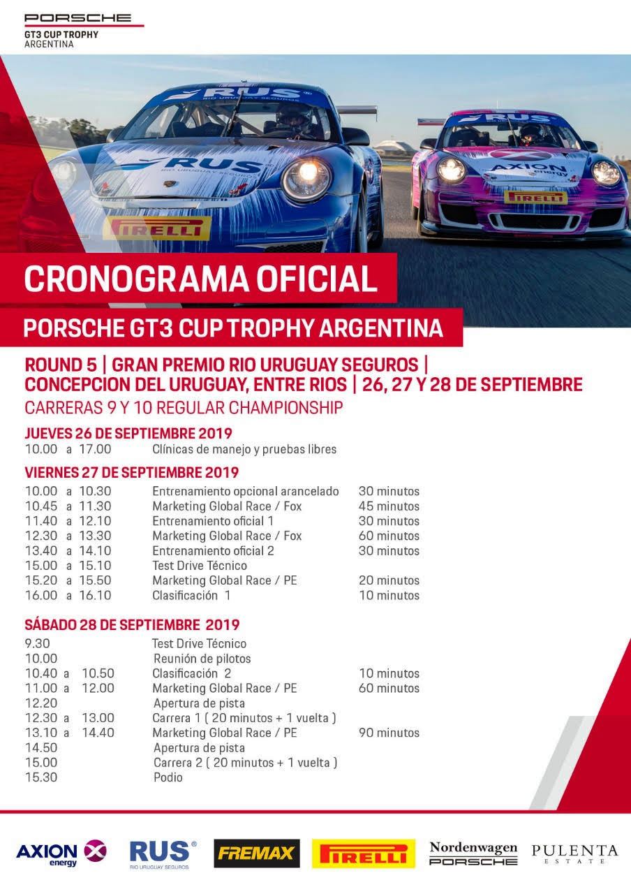 A continuación adjuntamos el cronograma de actividades del Round 5 de la Porsche GT3 Cup Trophy Argentina en Concepción del Uruguay.