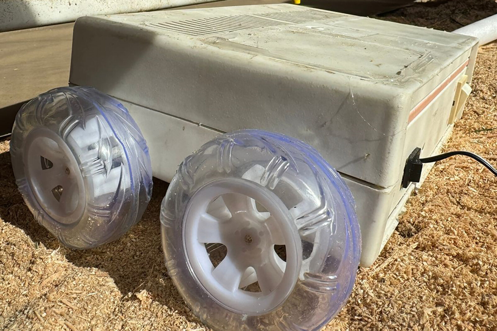 El robot es construido por estudiantes del ciclo básico de tercer año en el taller de computación, con la utilización de Arduino, una plataforma de creación de electrónica de código abierto y materiales reciclados en desuso, como por ejemplo la carcasa donde se encuentra montado. Las ruedas fueron diseñadas para optimizar la tracción en las camas de los galpones de pollos e impresas en las impresoras 3D por los estudiantes.