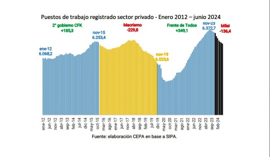 De acuerdo con un estudio del Centro Economía Política Argentina (CEPA), en el pasado mes de junio, se perdieron 12.603 puestos de trabajo registrados en el sector privado; en tanto que en los primeros siete meses de Javier Milei la caída totaliza 136.370 empleos. Para julio, según la Encuesta de Indicadores Laborales de la Secretaría de Trabajo, no se esperan modificaciones en la cantidad de puestos de trabajo.