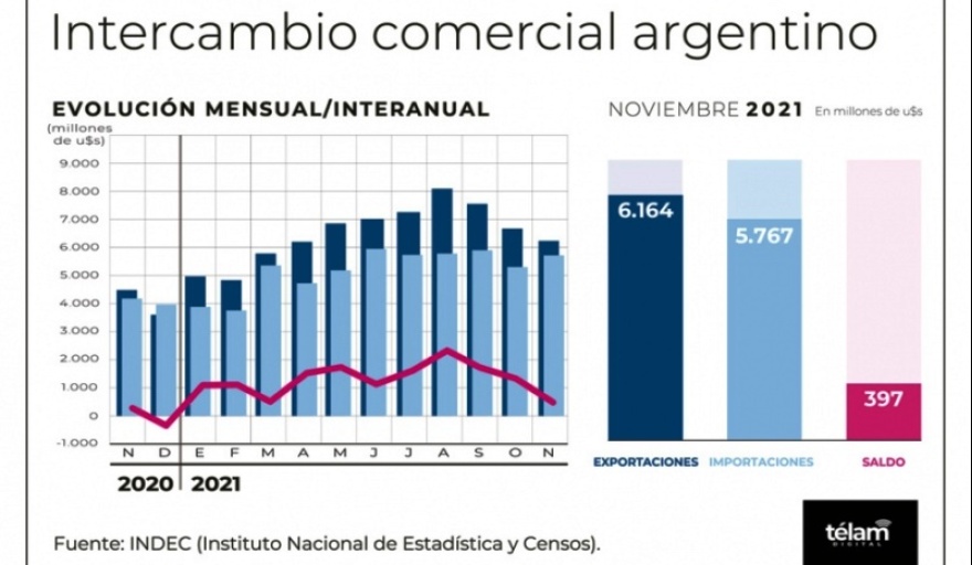 De acuerdo con el informe del Palacio San Martín, en noviembre, las importaciones totalizaron U$S 5.767 millones y el superávit comercial alcanzó los U$S 397 millones en el mes y U$S 14,3 mil millones, en 2021.
