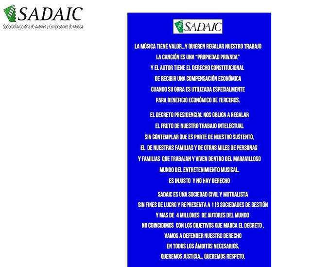 “Sadaic es una sociedad civil y mutualsita, sin fines de lucro. Y representa 113 sociedades de gestión y más de 4 millones de autores en el mundo. No coincidimos con los objetivos que marca el decreto. Vamos a defender nuestro derecho en todos los ámbitos necesarios. Queremos Justicia y queremos respeto”, cierra el comunicado.