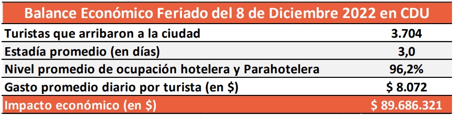 Durante el fin de semana largo del 8 al 11 de diciembre ingresaron 3.700 turistas a la ciudad, que gastaron $89,3 millones entre alojamiento, comidas, transporte, compras y recreación.