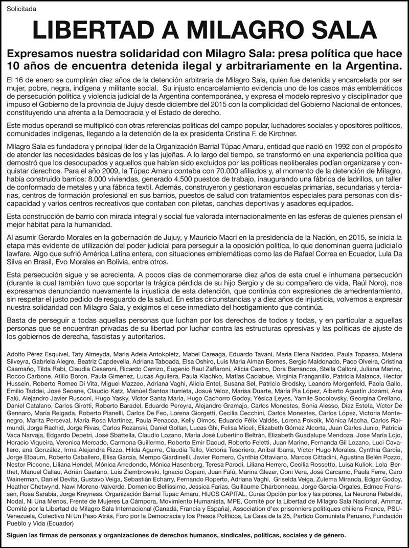 Decenas de referentes de derechos humanos, artistas, dirigentes políticos y sociales y distintas personalidades firmaron una solicitada para reclamar la libertad de Milagro Sala, a diez años de su detención en Jujuy.