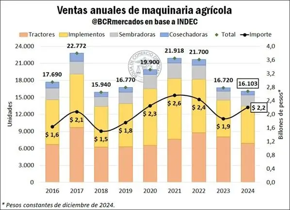 En este sentido, el número total de máquinas agrícolas vendidas totalizó apenas 16.103 unidades en 2024. En términos interanuales, significa una caída del 4 por ciento en el número de unidades vendidas, en tanto la contracción es del 17 por ciento si se tiene en cuenta el promedio del último quinquenio. «La caída interanual se debe a una merma en la venta de tractores, que no logró ser compensada por el incremento en la comercialización de cosechadoras, sembradoras e implementos, aunque todos los segmentos registraron bajas respecto del promedio. Hay que destacar que esta contracción en el volumen de ventas ocurre luego de una importante reducción interanual del 23 por ciento en 2023 (en plena sequía)”, según el documento de la Bolsa de Cereales rosarina.