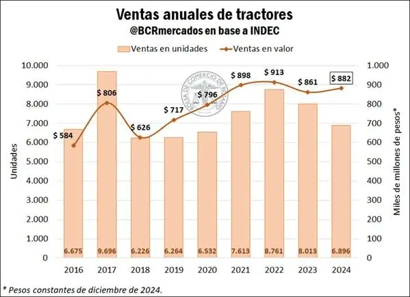 Las sembradoras ocuparon el tercer lugar, siendo responsables del 18 por ciento del importe total facturado, mientras que las ventas de cosechadoras se ubicaron en último lugar, con una participación del 17 por ciento de las ventas. En un estudio al interior de cada tipo de maquinaria, se advierte que en 2024 se vendieron 6.896 unidades de tractores, marcando una caída del 14 por ciento respecto al año anterior y del 7 por ciento respecto al promedio de los últimos cinco años. No obstante, en términos de valor, la venta de tractores alcanzó un importe anual de 881.800 millones de pesos, registrando un crecimiento interanual real del 2 por ciento y ubicándose 5 por ciento por encima del promedio.