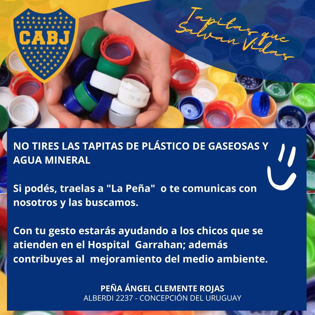 Las tapitas se pueden acercar a la peña ubicada en Calle Alberdi 2237 Concepción del Uruguay, los días de partido. Por cada botellón de 5 o 6 lts de Agua Mineral completo de tapitas, se les entregará un cupón válido por un sorteo de una camiseta de Boca Juniors, autografiada por los jugadores. A estos efectos también habilitaron la comunicación por whatsapp al tel. 3442 586440.