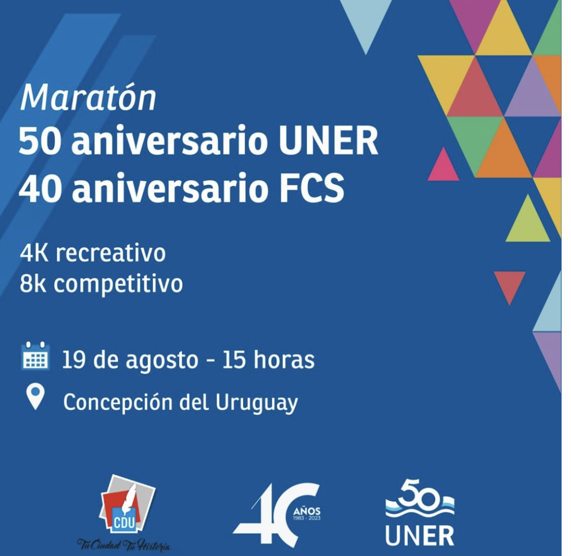 La comunidad educativa de la Universidad Nacional de Entre Ríos, celebran este año, el 50° aniversario de la Institución, y también los 40 años de la creación de la Facultad de Ciencias de la Salud (FCS), por lo que este sábado 19 de agosto, a las 15hs, se realizará la Maratón UNER-FCS en la sede de la Facultad situada en Lorenzo Sartorio 2160.