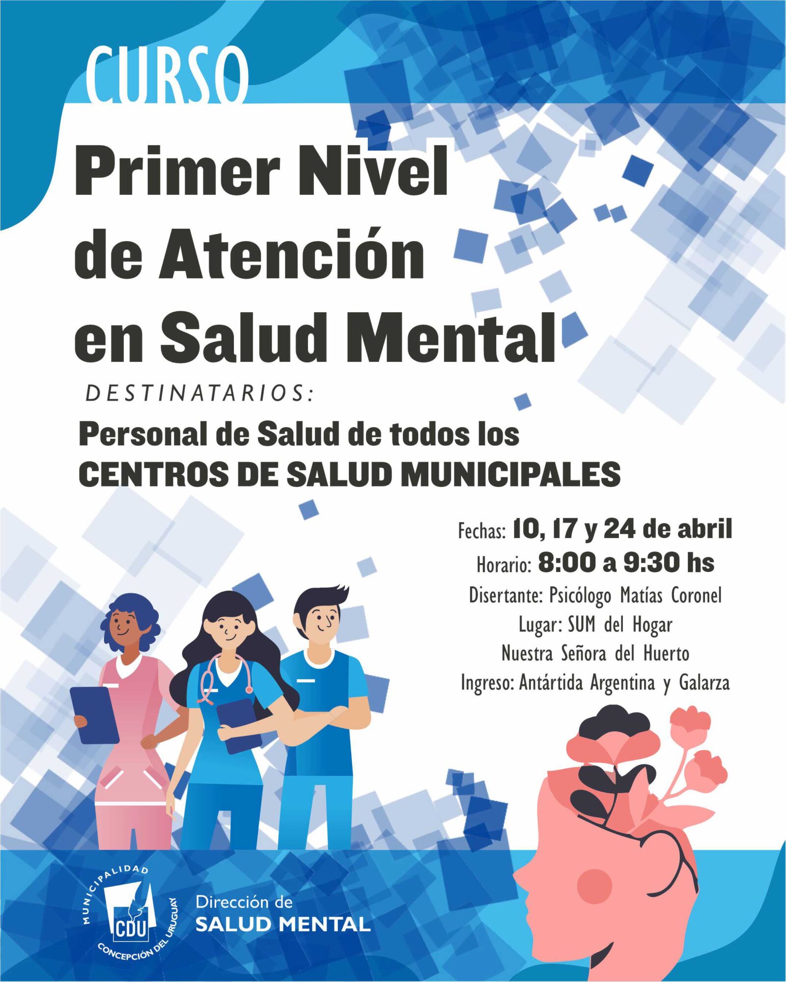 La propuesta consiste en el curso “Primer nivel de atención en salud mental”, que será dictado por el psicólogo Matías Coronel y que se desarrollará en tres encuentros durante el mes de abril. Concretamente se desarrollarán 10, 17 y 24 de abril, de 8 a 9.30 en el SUM del Hogar “Nuestra Señora del Huerto”.