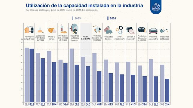 En ese sentido, la utilización de la capacidad instalada en la industria se ubicó en 54,5% en junio, nivel inferior al del mismo mes de 2023, que fue de 68,6%. Los bloques sectoriales que se ubican debajo del nivel general son productos minerales no metálicos (46,8%), productos textiles (43,9%), metalmecánica excepto automotores (42,0%), edición e impresión (41,3%), productos de caucho y plástico (39,4%), industria automotriz (39,0%), y productos del tabaco (35,4%).