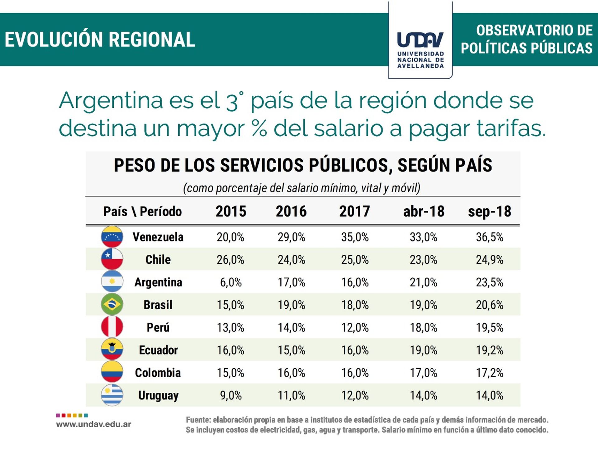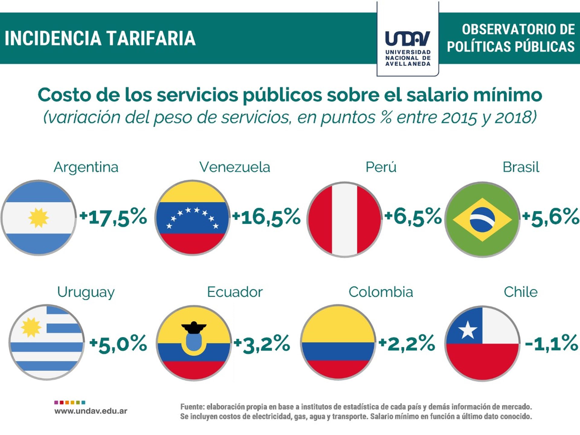 El proceso de recomposición del precio de los servicios públicos puesto en marcha desde 2016 fue el más abrupto de la historia argentina, por su magnitud y velocidad de ejecución, señaló un informe de la Universidad de Avellaneda (Undav). En ese marco, el estudio arrojó que «Argentina fue el país que mayor aumento verificó en términos de carga de los servicios públicos sobre el salario mínimo, en los últimos tres años».