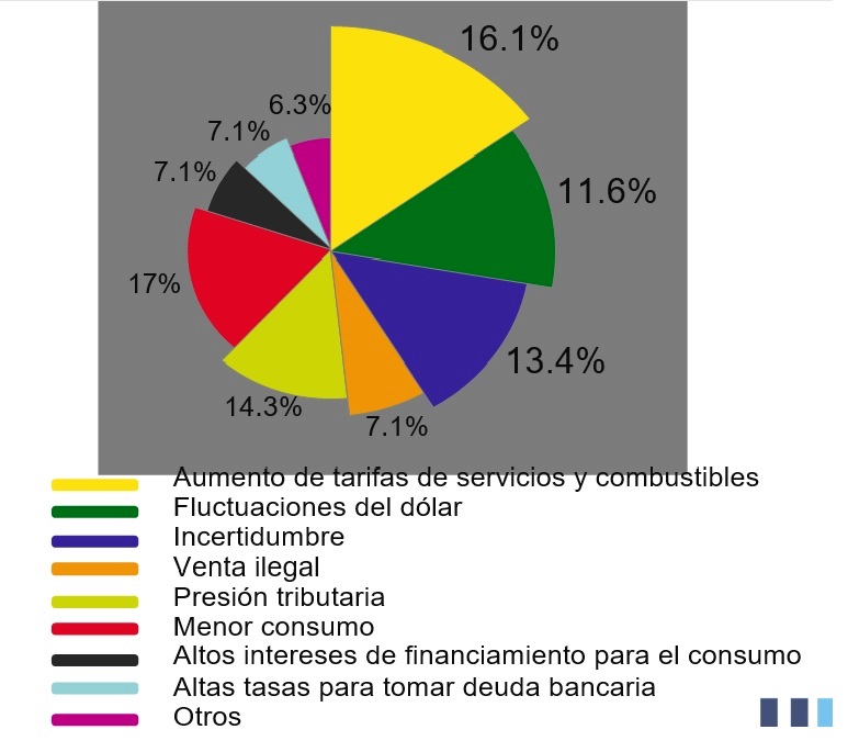 En esta consulta se puede observar que los ítems: 1 – Aumento desmedido de tarifas de servicios y combustibles, 2 – Fluctuaciones del dólar, 3 – Incertidumbre con respecto al futuro económico y 7 – Altas tasas de interés al financiamiento para el consumo son cuestiones que han empeorado claramente en el último año y han tenido una aceleración negativa para el sector que el CECOM representa desde marzo del año pasado a la fecha. Tornando en algunos casos la situación como crítica incluso llevando a peligrar la continuidad de algunos emprendimientos comerciales, según dichos de los encuestados.