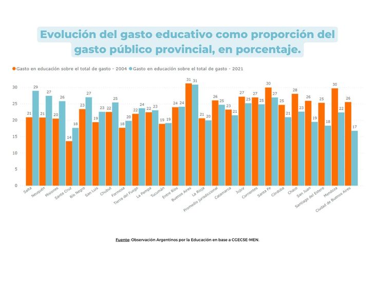 Por ejemplo, se observó que comparando 2004 vs 2021, las jurisdicciones que dedicaron mayor proporción de su presupuesto a la educación fueron la provincia de Buenos Aires (30,8%), Salta (28,8%) junto a Neuquén y Río Negro (27%).