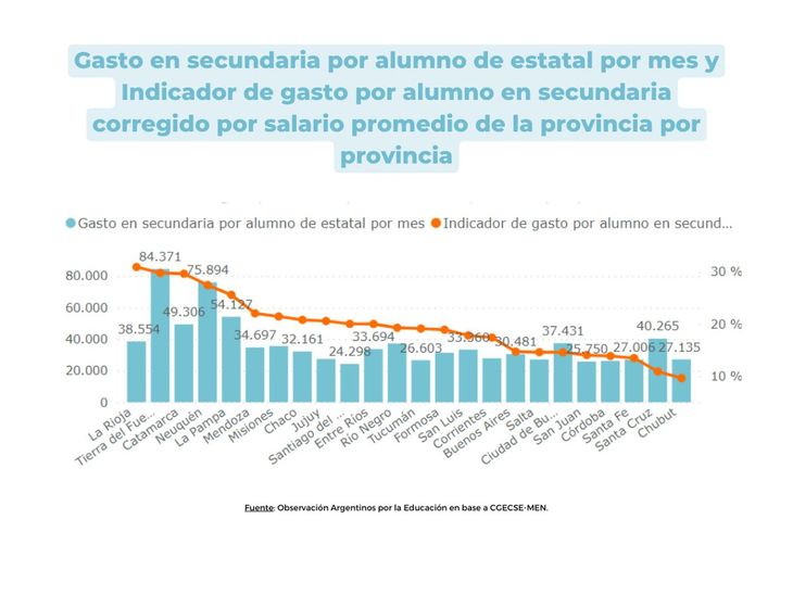 En cuanto al nivel secundario, La Rioja fue la que más gastó, seguida de Tierra del Fuego. Las que menos gastaron fueron Santa Cruz y Chubut.