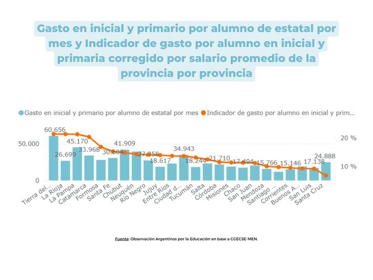 Por otro lado, los distritos que menos recursos asignaron con fueron CABA (16,7%) y Santa Cruz (17,6%) y Santiago del Estero(18%).»Cada vez que se habla de inversión educativa se suele mirar al Estado nacional, pero se soslaya que la responsabilidad es de las provincias. El trabajo permite ver a todas y cada una de ellas”, indicó Alejandro Morduchowicz, especialista en planeamiento educativo.