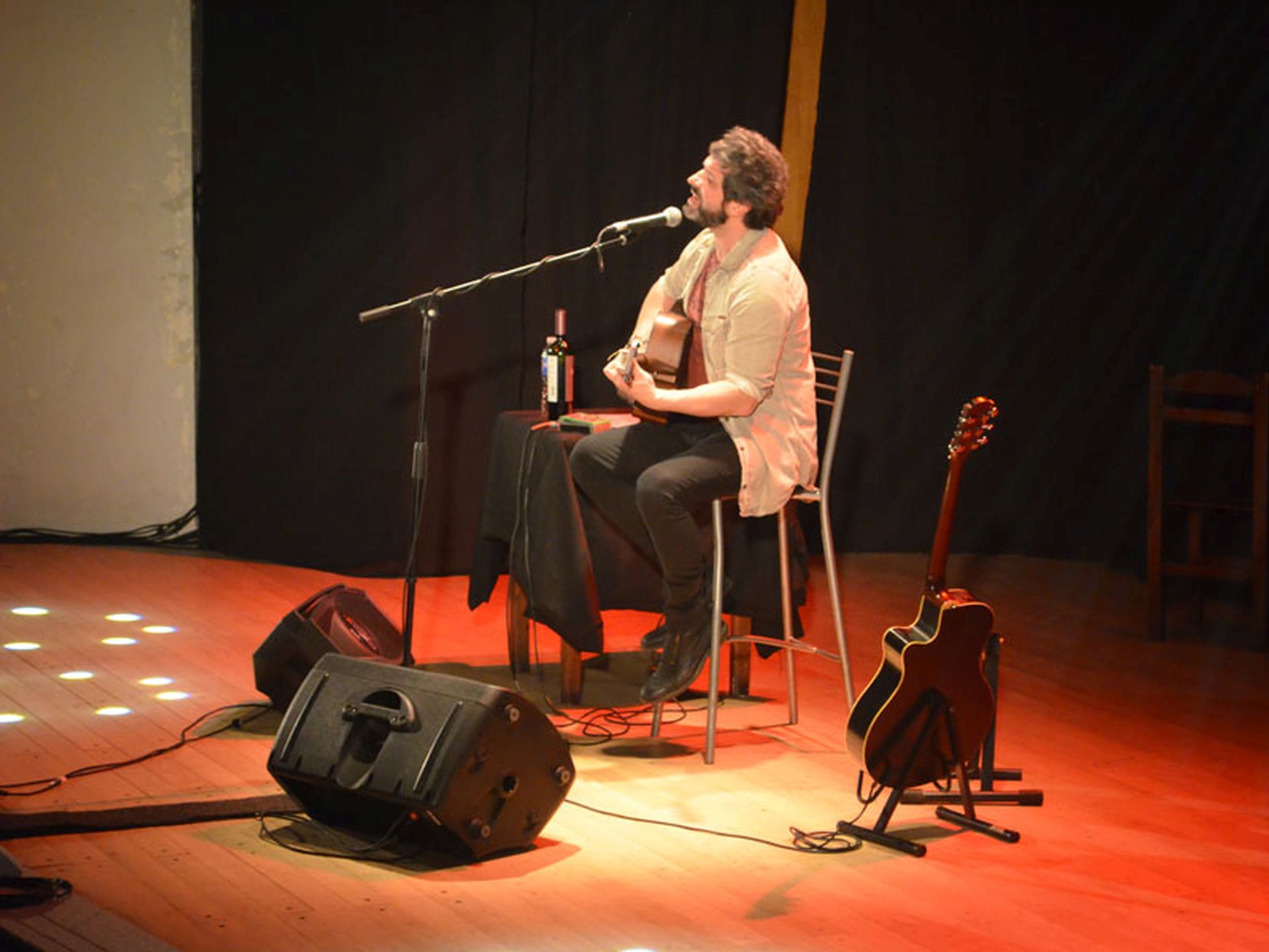 El auditorio Scelzi era el lugar elegido para este show íntimo y se fue completando lentamente con parejas y jóvenes mujeres uruguayenses que se acercaron para disfrutar de la música del ex líder de Los Caballeros de la Quema, que hizo su aparición apenas diez minutos luego de lo pautado en el sencillo escenario conformado por dos guitarras, una banqueta y una mesa donde yacía apoyado un vino tinto y una pequeña botella de agua.