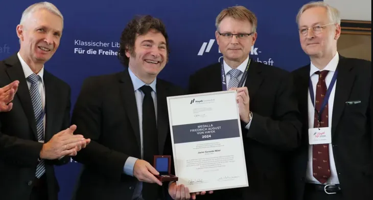 El presidente Javier Milei recibió el sábado en la ciudad de Hamburgo, en el norte de Alemania, una medalla de la Sociedad Hayek, de corte neoliberal, que considera que el mandatario lidera un cambio de curso fundamental para “liberar de grilletes” a la población y devolverle “la esperanza”.