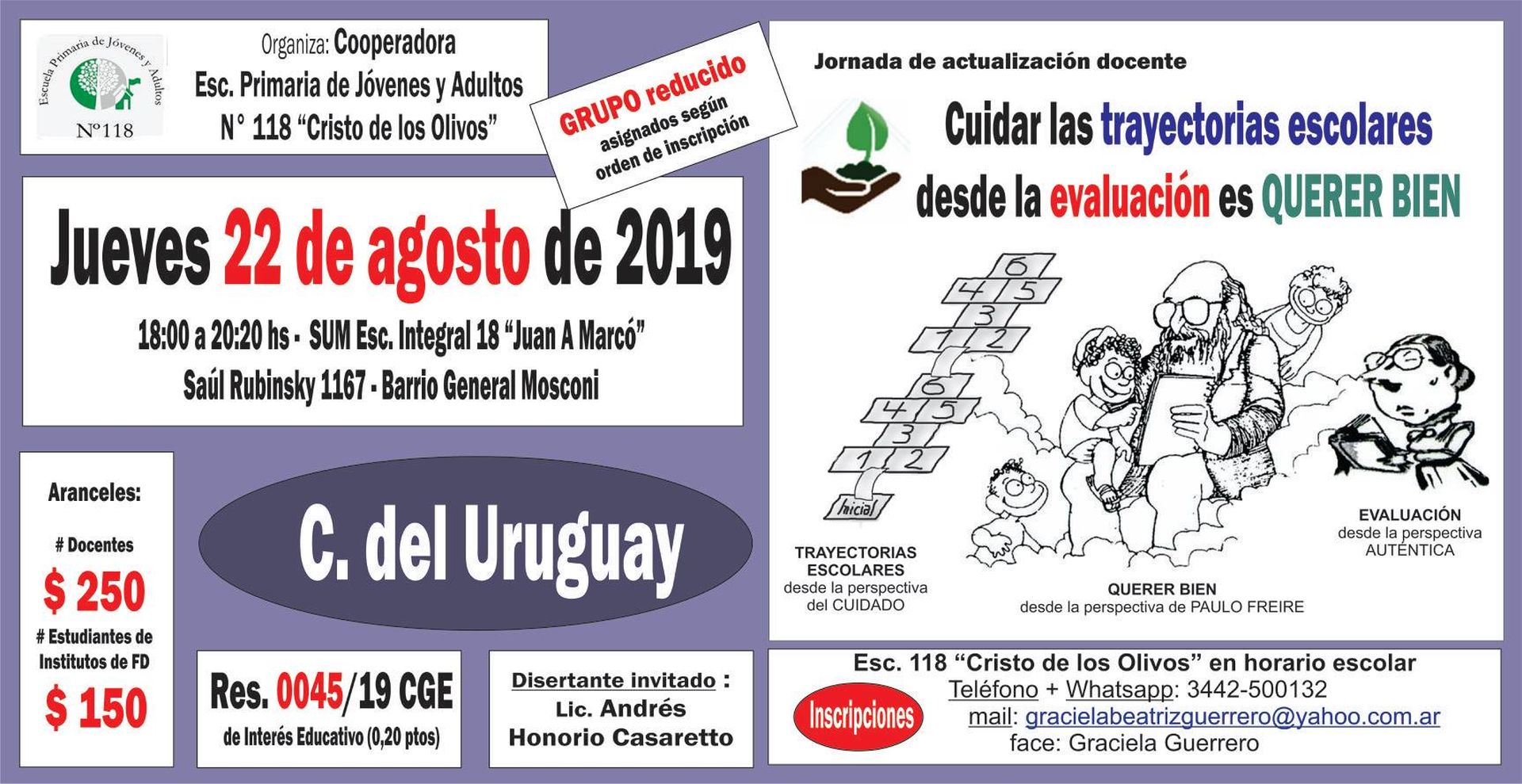 En la Jornada de actualización docente “Cuidar las trayectorias escolares desde la evaluación es QUERER BIEN”, el Licenciado Andrés Honorio Casaretto disertará nuevamente en el ciclo impulsado por la Escuela primaria de Jóvenes y Adultos 118 “Cristo de los Olivos”. Será el próximo 22 de agosto, desde las 18, en la Escuela Integral N° 18 “Juan Marcó”, donde funciona.