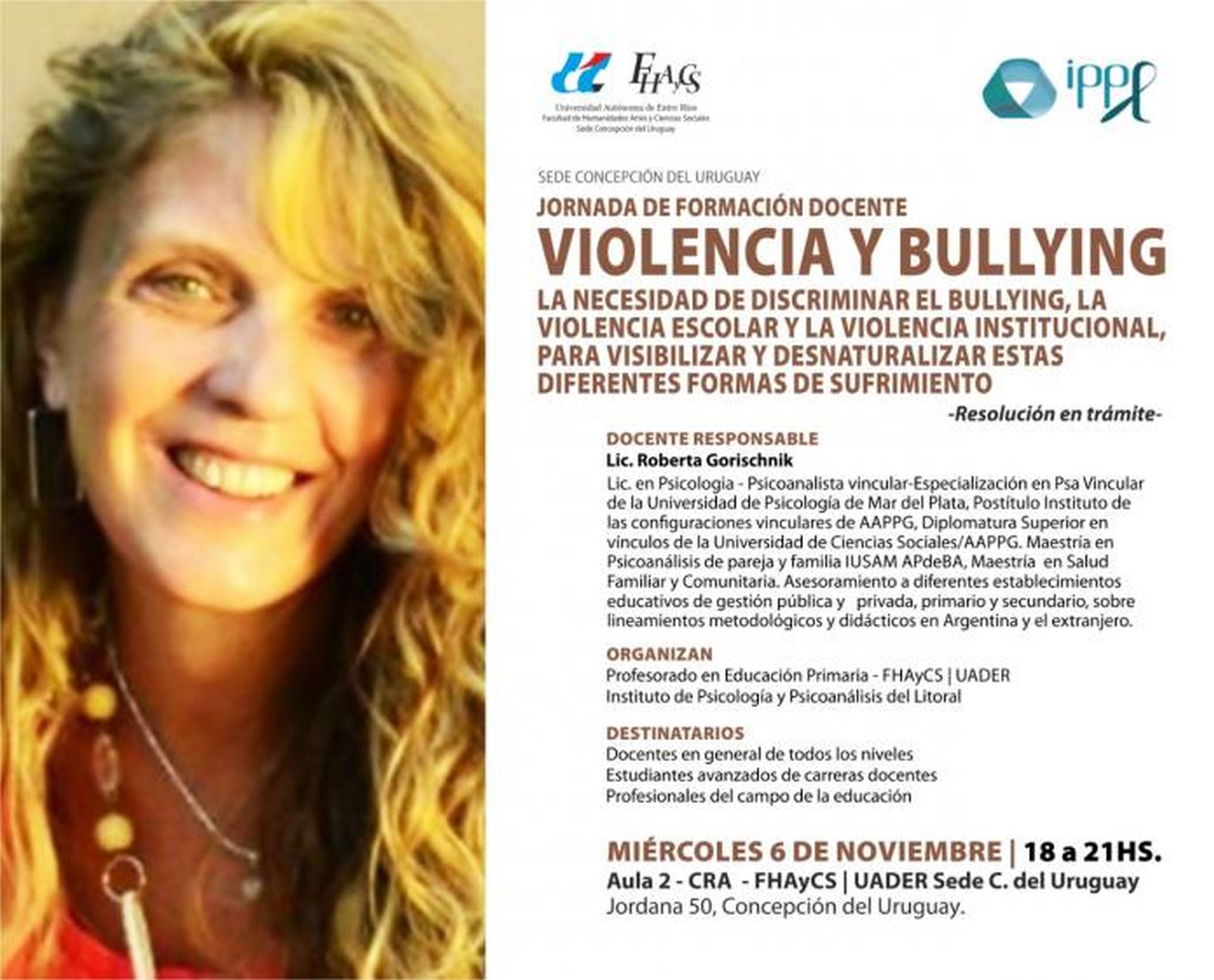 Con la necesidad de discriminar el bullying, la violencia escolar y la violencia institucional, para visibilizar y desnaturalizar estas diferentes formas de sufrimiento, disertará la Lic. Roberta Gorischnik, Directora del Instituto de Psicologia y Psicoanálisis del litoral –IPPL-, Lic en Psicologia, Psicoanalista vincular, Especialización en Psa Vincular de la Universidad de psicología de Mar del Plata, Postítulo Instituto de las configuraciones vinculares de AAPPG, Diplomatura Superior en vínculos de la Universidad de Ciencias Sociales/AAPPG. Maestría en Psicoanálisis de pareja y familia IUSAM APdeBA, Maestría en Salud Familiar y Comunitaria. Asesoramiento a diferentes establecimientos educativos de gestión pública y privada, en primaria y secundaria, sobre lineamientos metodológicos y didácticos en Argentina y el extranjero.