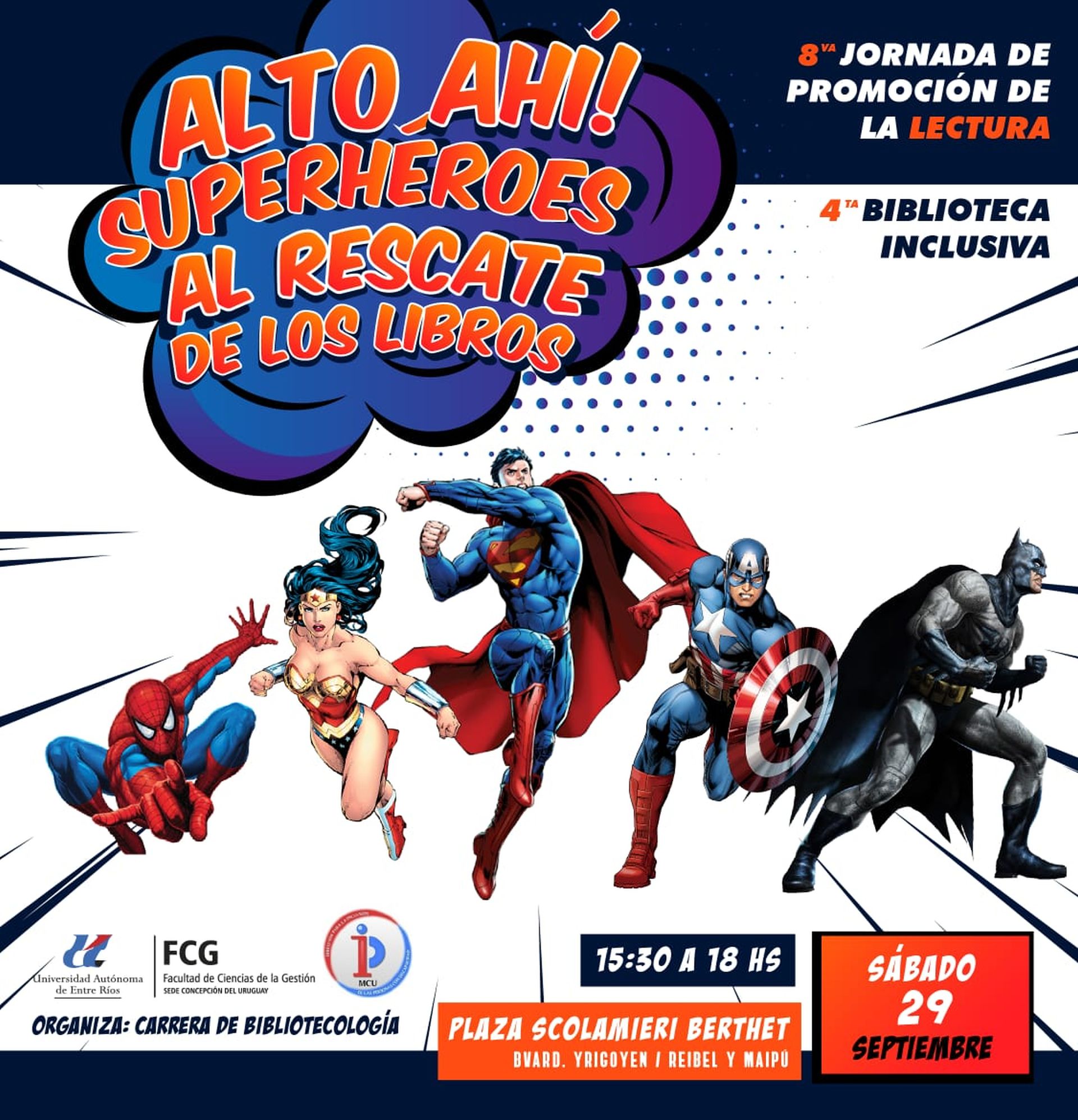 Se realizará la 8° Jornada de Promoción de la Lectura y la 4° Biblioteca Inclusiva, el sábado 29 de septiembre en plaza “Scolamieri Berthet”. La actividad es organizada por la carrera de Bibliotecología de UADER, con apoyo de la Dirección para la Inclusión de las Personas con Discapacidad de la Municipalidad de Concepción del Uruguay. Se desarrollará según el siguiente programa: