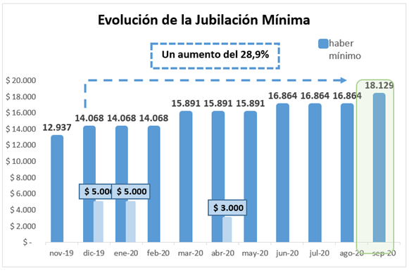 La ANSES informa que a partir del aumento de 7,5 por ciento de septiembre el acumulado en lo que va del año será del 28,9 por ciento para las jubilaciones y pensiones más bajas. Eso significa que en el primer semestre del año 2020 el haber mínimo aumentó, en términos reales, un 5,5%, recuperando así parte de la pérdida producida entre septiembre de 2017 y diciembre de 2019 de un 19,5 por ciento.