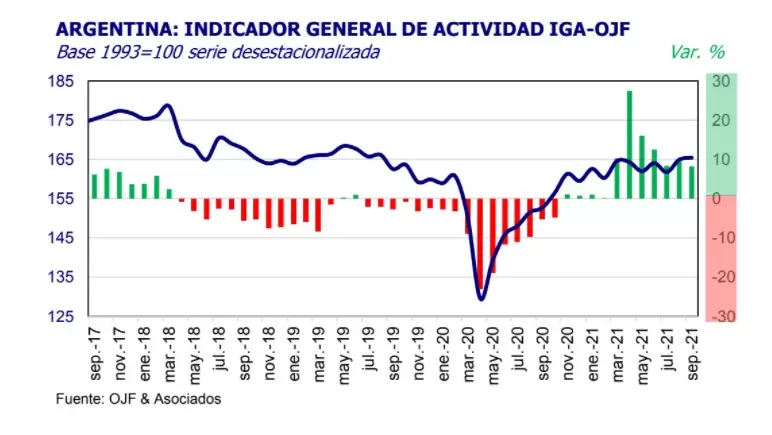 En tanto, el Indice General de Actividad (IGA) de la consultora marcó un crecimiento de 8,3% interanual en el noveno mes, acumulando para lo transcurrido del año un avance del 10,1% en comparación al mismo período de 2020.