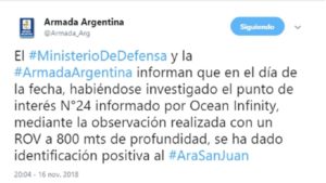 «El Ministerio de Defensa y la Armada Argentina informan que en el día de la fecha habiéndose investigado el (Punto Dato) POI 24 informado por la empresa Ocean Infinity, mediante la observación realizada con un ROV (vehículo de observación remota) a 800 mts de profundidad, se ha dado identificación positiva al submarino ARA San Juan», señaló un breve comunicado.