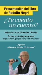 La Biblioteca Popular El Porvenir, continuando con la difusión de la tarea cultural que se desarrolla en nuestra ciudad, presenta el 16 de diciembre a las 18 horas en forma virtual al nuevo libro del escritor uruguayense Rodolfo Oscar Negri ¿Te cuento un cuento?.