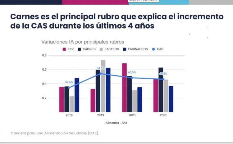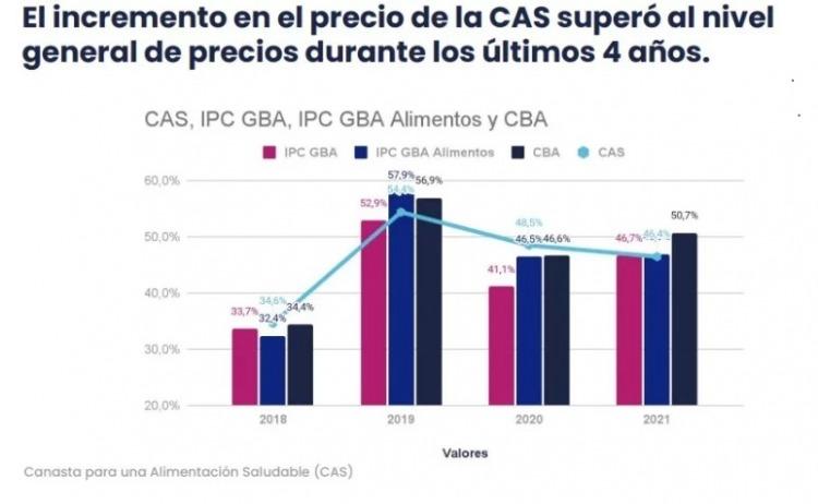 En este sentido, plantean que para el mismo febrero, el costo de la CAS para una familia tipo de dos adultos y dos niños fue de 51.233 pesos, es decir un 25,2 % más cara de los 37.413 de la CBA, lo que implicó además un segundo mes consecutivo de aumento de la brecha entre ambas canastas, debido a su incremento en ese lapso del 17 %. Pero en rigor, la tendencia fue sostenida durante los últimos cuatro años, donde el precio de la CAS superó al nivel general de precios, debido mayormente al rubro carnes, más allá de que entre 2020 y 2021 se produjera una lenta desaceleración en su incremento de precios.