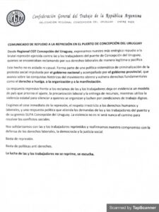 Violenta represión a trabajadores en Concepción del Uruguay. Denuncian un complot