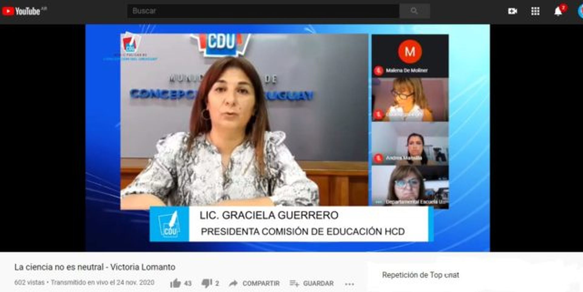 El pasado martes, se concretó el primer encuentro virtual denominado “La Ciencia no es neutral”, que tuvo como responsable y moderadora, a la titular de Educación del Concejo Deliberante, Lic. Graciela Guerrero. La actividad surgió gracias al trabajo conjunto con otras áreas del gobierno municipal, como Desarrollo Social, que conduce Marianela Marclay y su gestión educativa, a cargo de la Prof. Marisa Díaz. Del equipo participó además la máxima autoridad de Educación del CGE en el Departamento, Prof. Ana María Díaz y una treintena de instituciones de todos los niveles educativos de la ciudad y la zona.