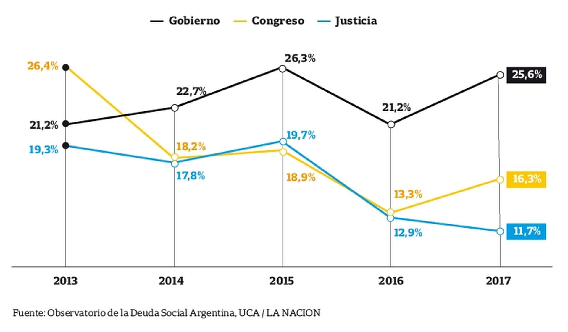 El matutino oficialista La Nación, en una nota firmada por el periodista Mariano De Vedia, informa sobre el porcentaje de confianza que tiene la población en los diferentes poderes del estado en un estudio realizado por el Observatorio de la Deuda Social Argentina de la Universidad Católica Argentina (UCA). Tal vez lo mas destacable –por su notable caída- es el índice de credibilidad en la Justicia, que bajó de 19,7 al 11,7.