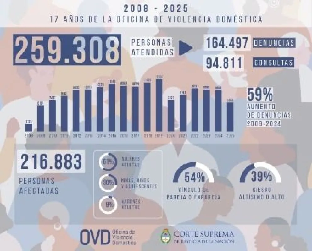 La Oficina de Violencia Doméstica de la Corte Suprema de Justicia de la Nación presentó un informe agregado con motivo de su aniversario. Atendió a más de 260.000 personas. Entre las afectadas, las mujeres son amplia mayoría. En el período de 17 años que abarca el informe hubo 164.497 denuncias con 216.883 personas afectadas, y un total de 94.811 consultas informativas. El lunes 15 la Oficina de Violencia Doméstica cumplirá 17 años de atención ininterrumpida.